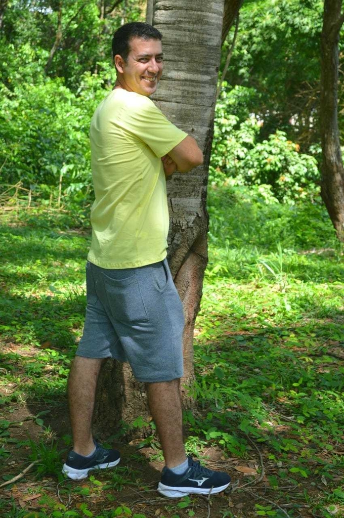 O bermuda masculina cinza no tecido de moletom, que também está em alta. Com bolsos frontais e trazeiros.