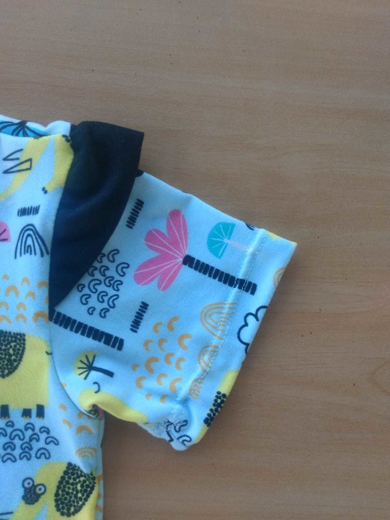 | Cor da camiseta | divertida azulada (com objetos do mundo infantil estilo safari) e um detalhe preto na manga |