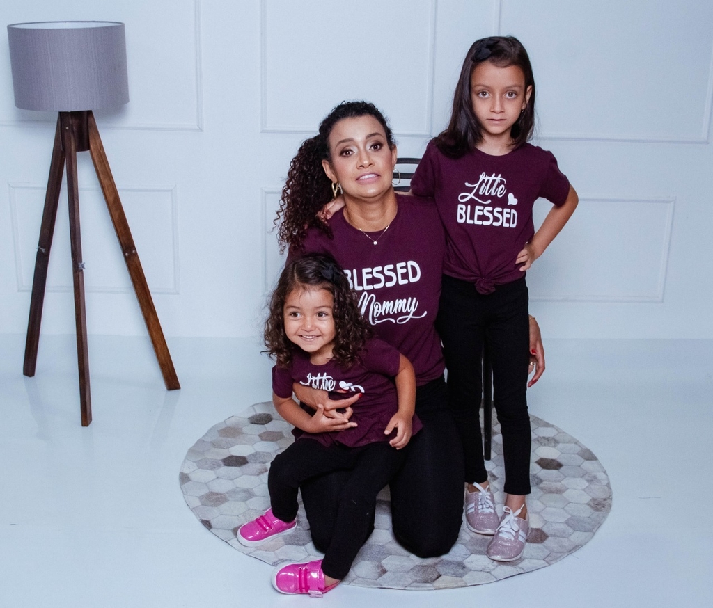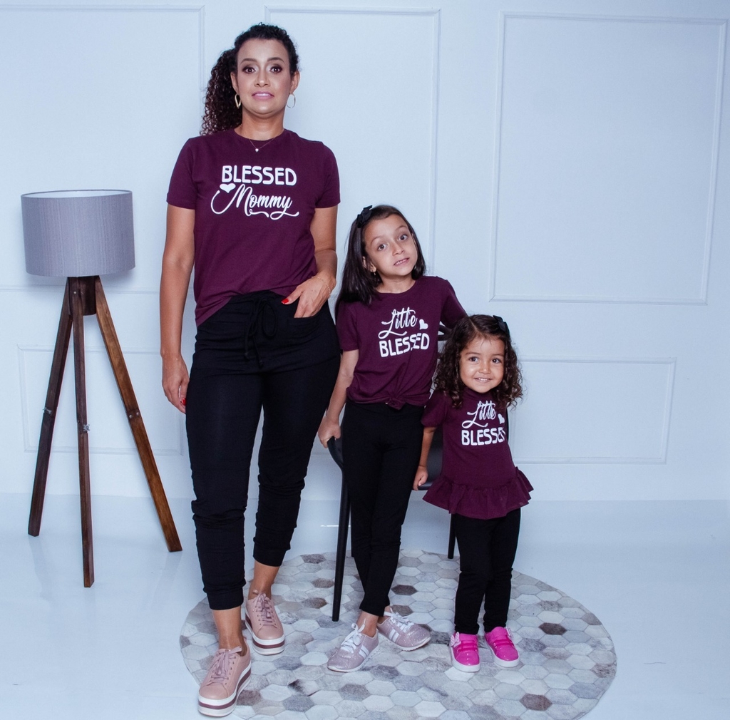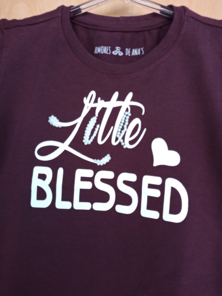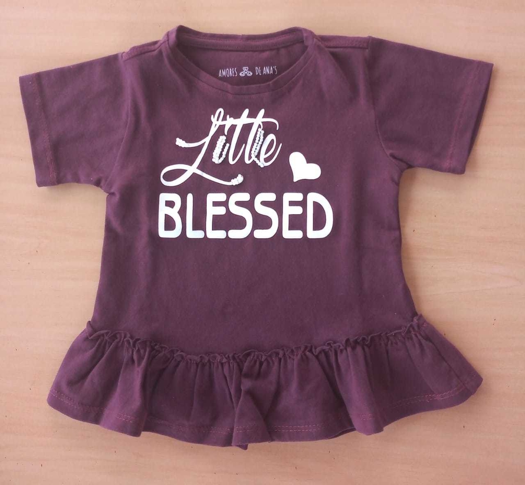 T-shirts em meia malha algodão e elástano com Silk Screen escrito Little Blessed (pequena abençoada) com aplicação manual de pérolas . O elástano da conforto e praticidade para o dia a dia. Com babado.